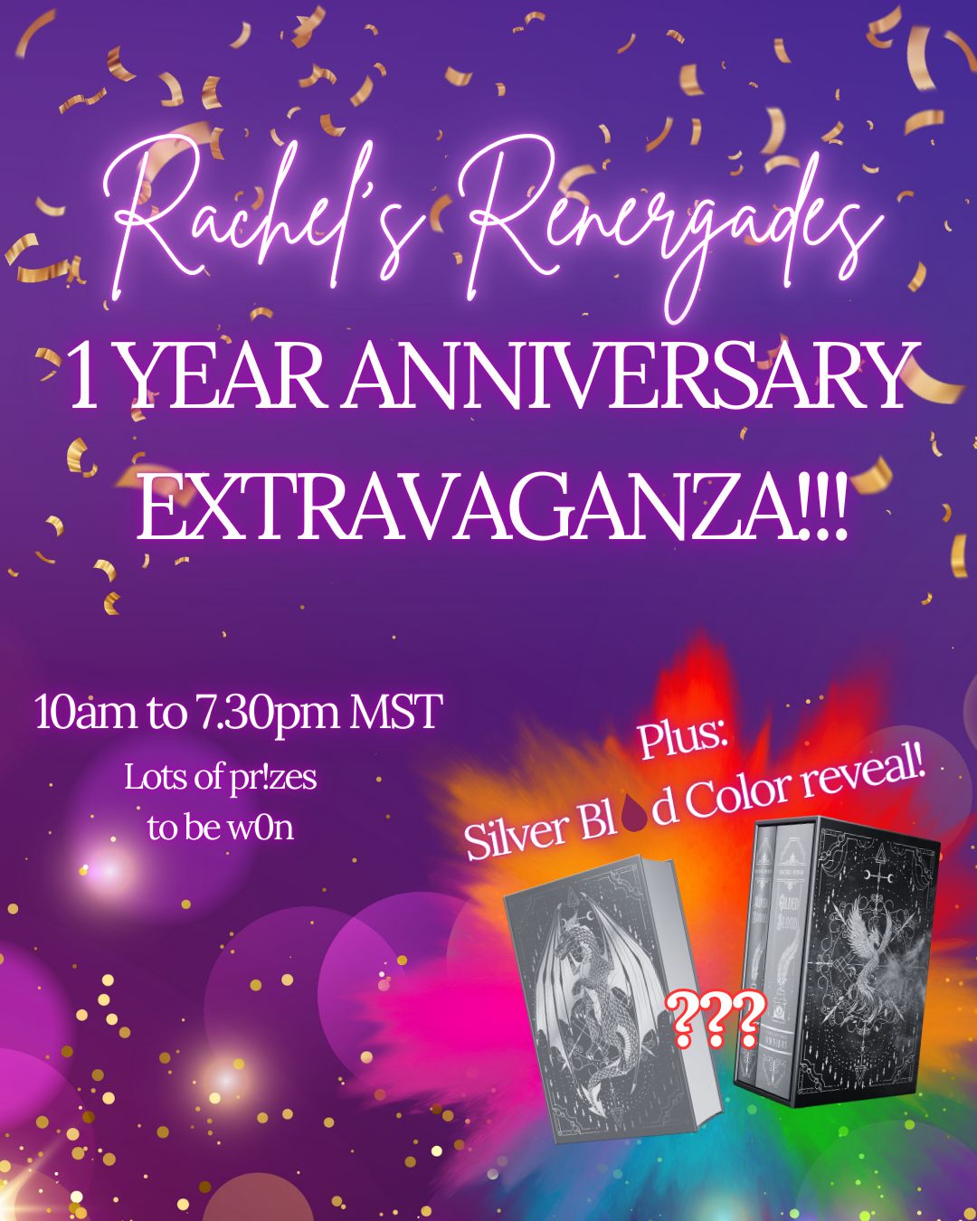 Come join our 1-Year Anniversary Extravaganza this Thursday, October 2nd, in the Renergades FB Group, where I will be announcing Silver BIood's gorgeous new look!! We will be giving out pr!zes all day, culminating in two grand pr!zes: the NEW Silver BIood special edition + matching Silver BIood slipcase, and the NEW Silver + Gilded BIood 2-book combo with the updated slipcase.