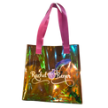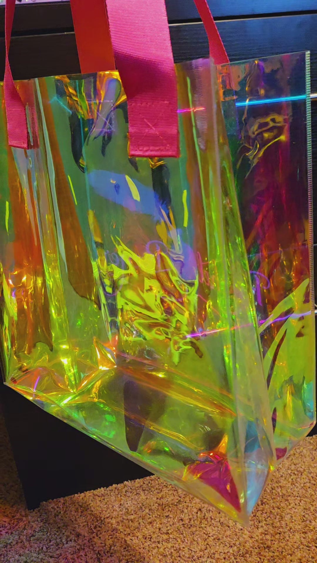 Transparent, iridescent vinyl tote with sturdy, sewn fabric strap. (YES, THE STRAP IS PINK.)